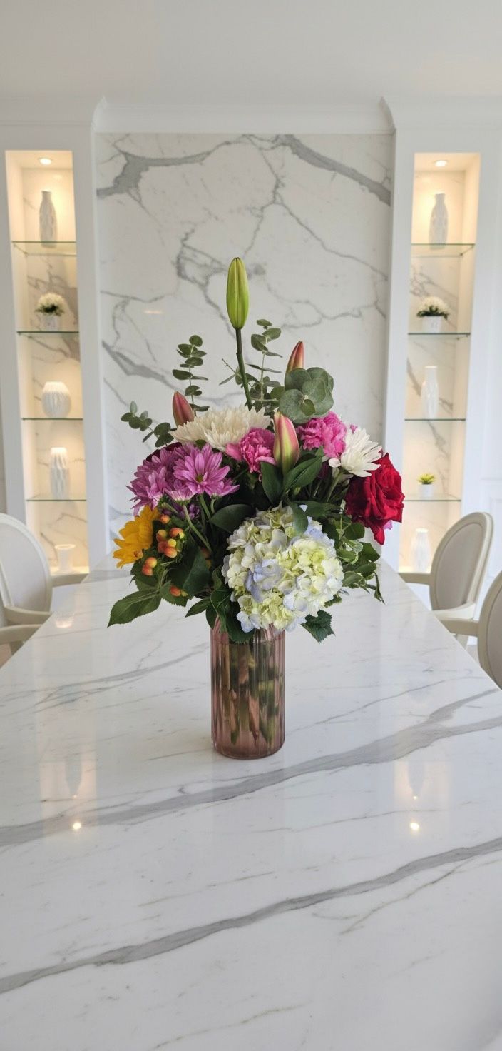 A tall, elegant vase filled with lilies, roses, hydrangeas, and seasonal flowers in vibrant tones. A symphony of colors that brings joy and sophistication to any space.