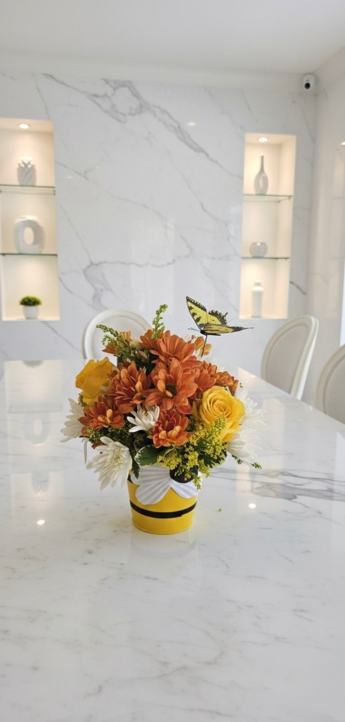 Cheerful yellow roses and orange chrysanthemums adorned with a delicate butterfly accent. A joyful gift full of life.